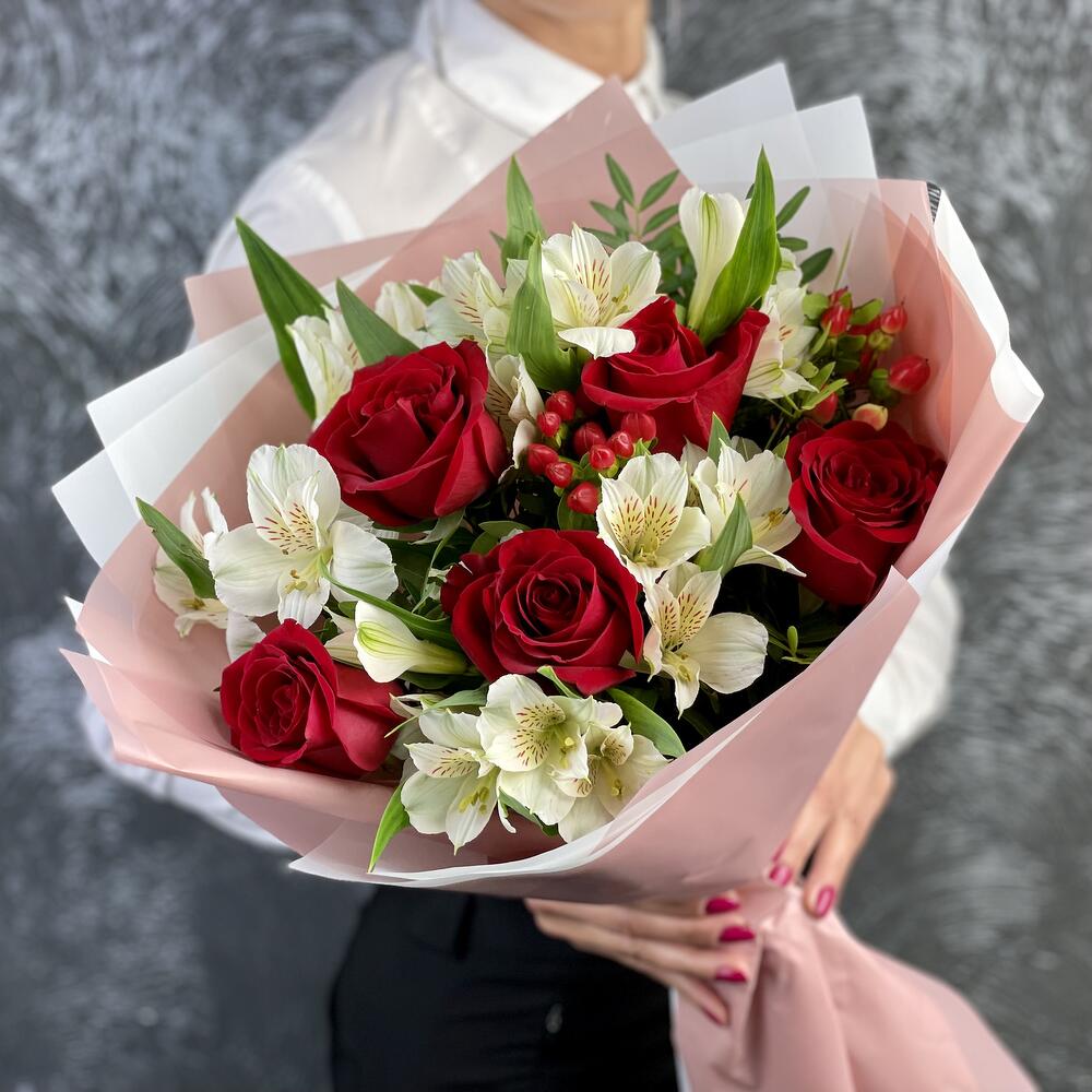 Элегантная композиция из 5 красных эквадорских роз и 4 белых альстромерий с добавлением фисташковой зелени и гиперикума. Изысканный подарок для особых моментов. Заказ цветов с доставкой на дом Адыгейск.