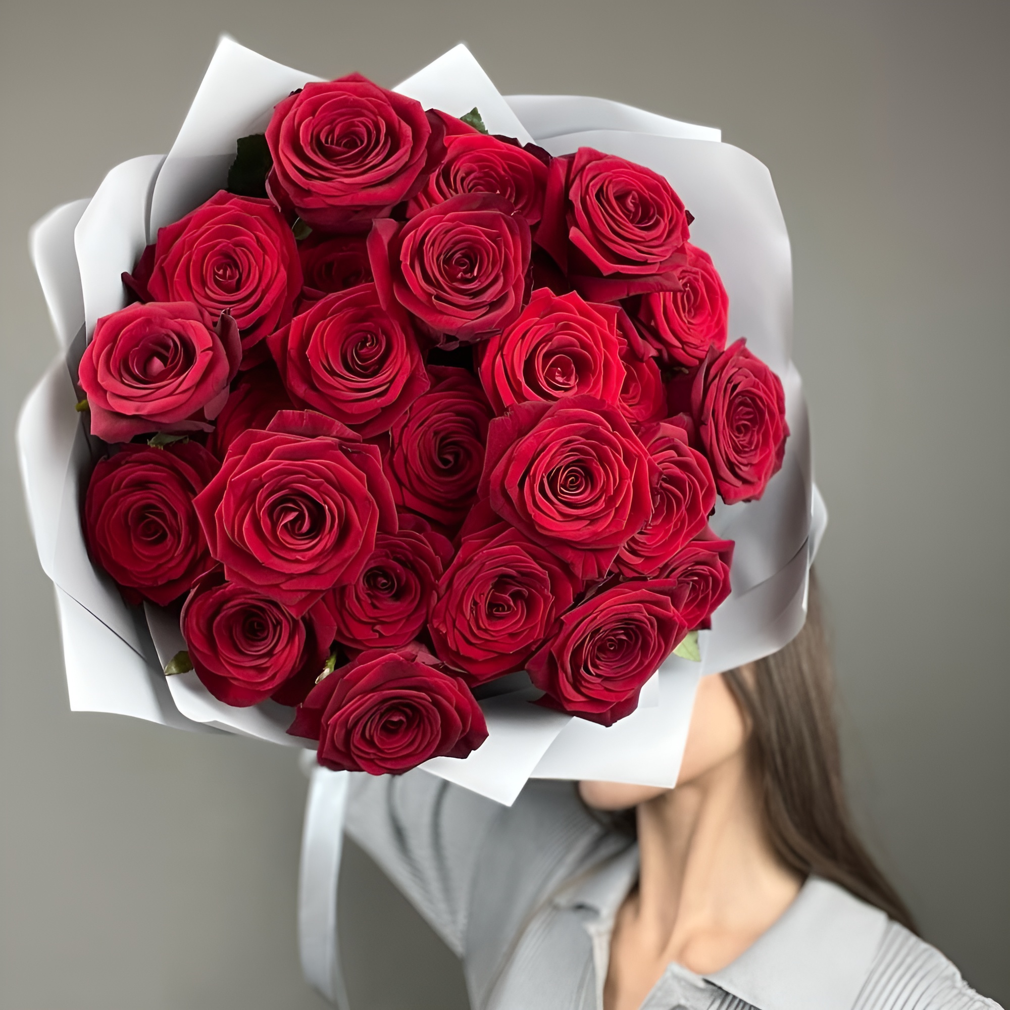 Изысканный букет из 25 роз красного оттенка с длиной стебля 60 см — воплощение королевской роскоши.