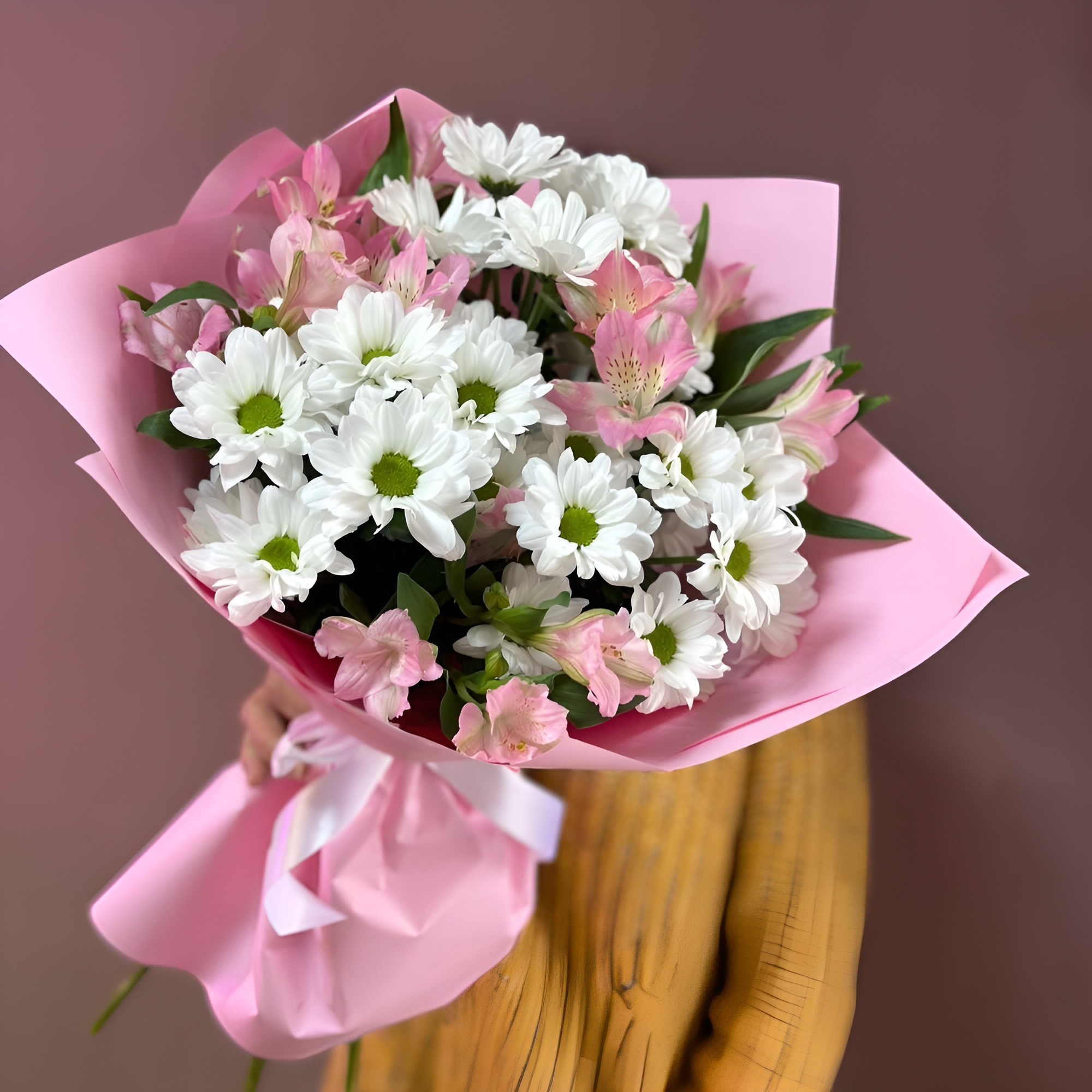 Букет «Поцелуй бабочки» нежность белых хризантем и розовых альстромерий