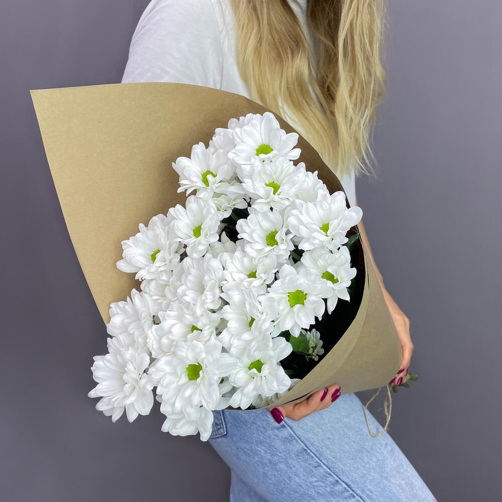 Минималистичный букет из 5 белоснежных хризантем в стильной крафтовой упаковке.