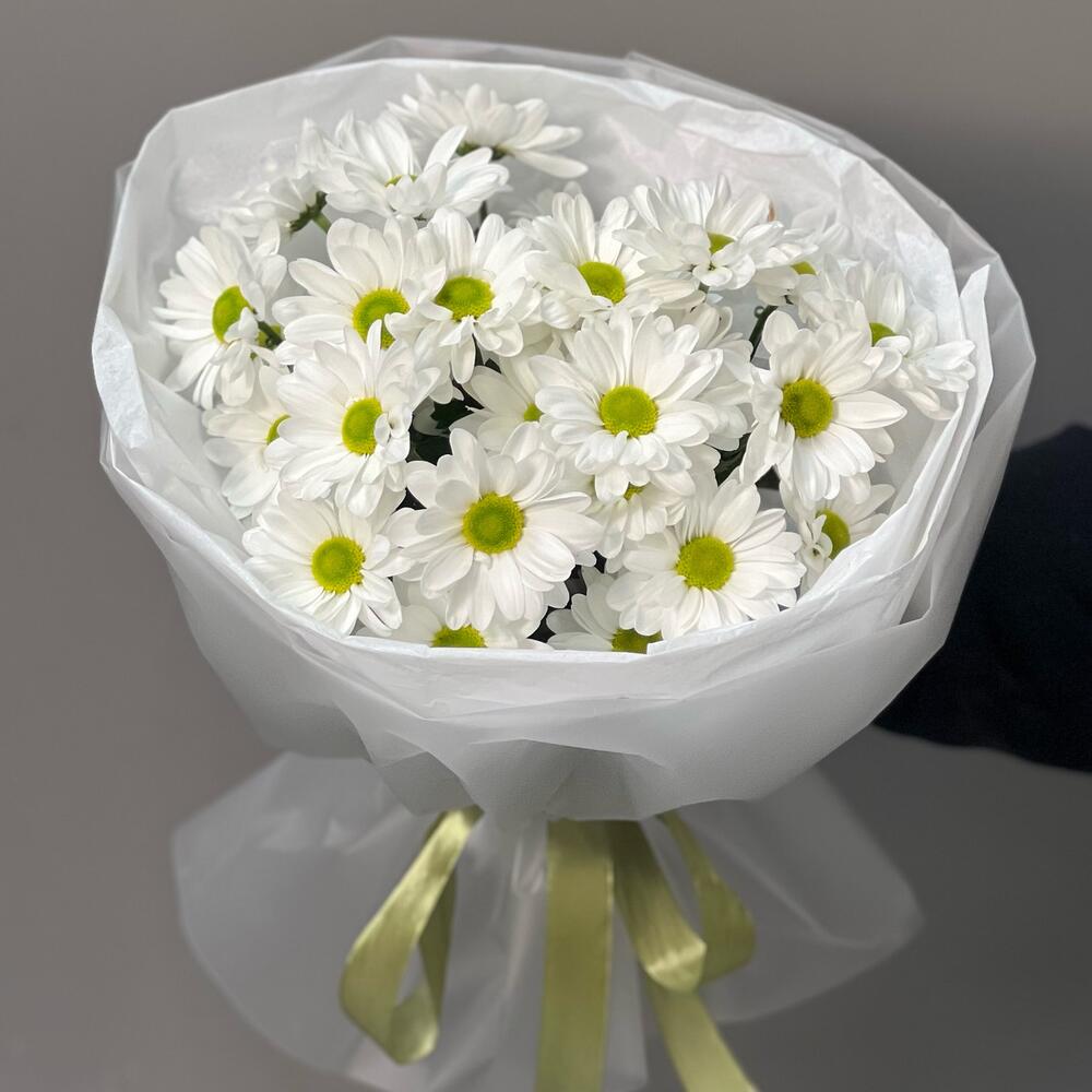 Очаровательный букет «Ромашковый» из белоснежных кустовых хризантем напоминает летнее поле.