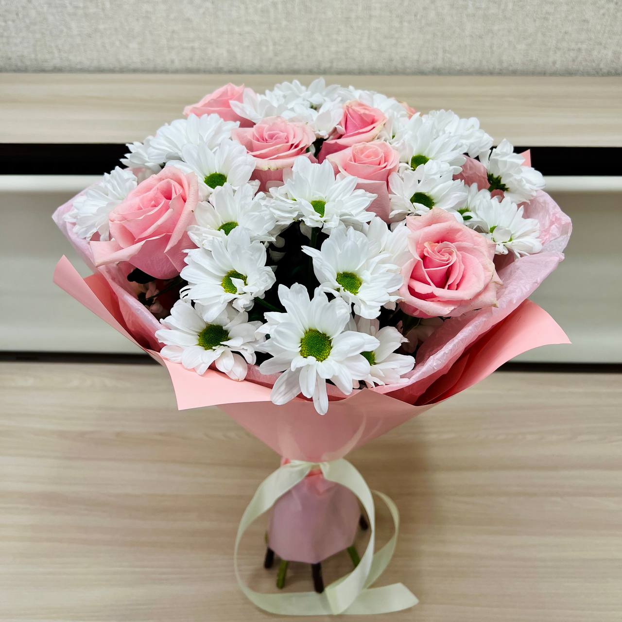 Букет «Ягодное Рафаэлло» – нежность розовых роз и белых хризантем